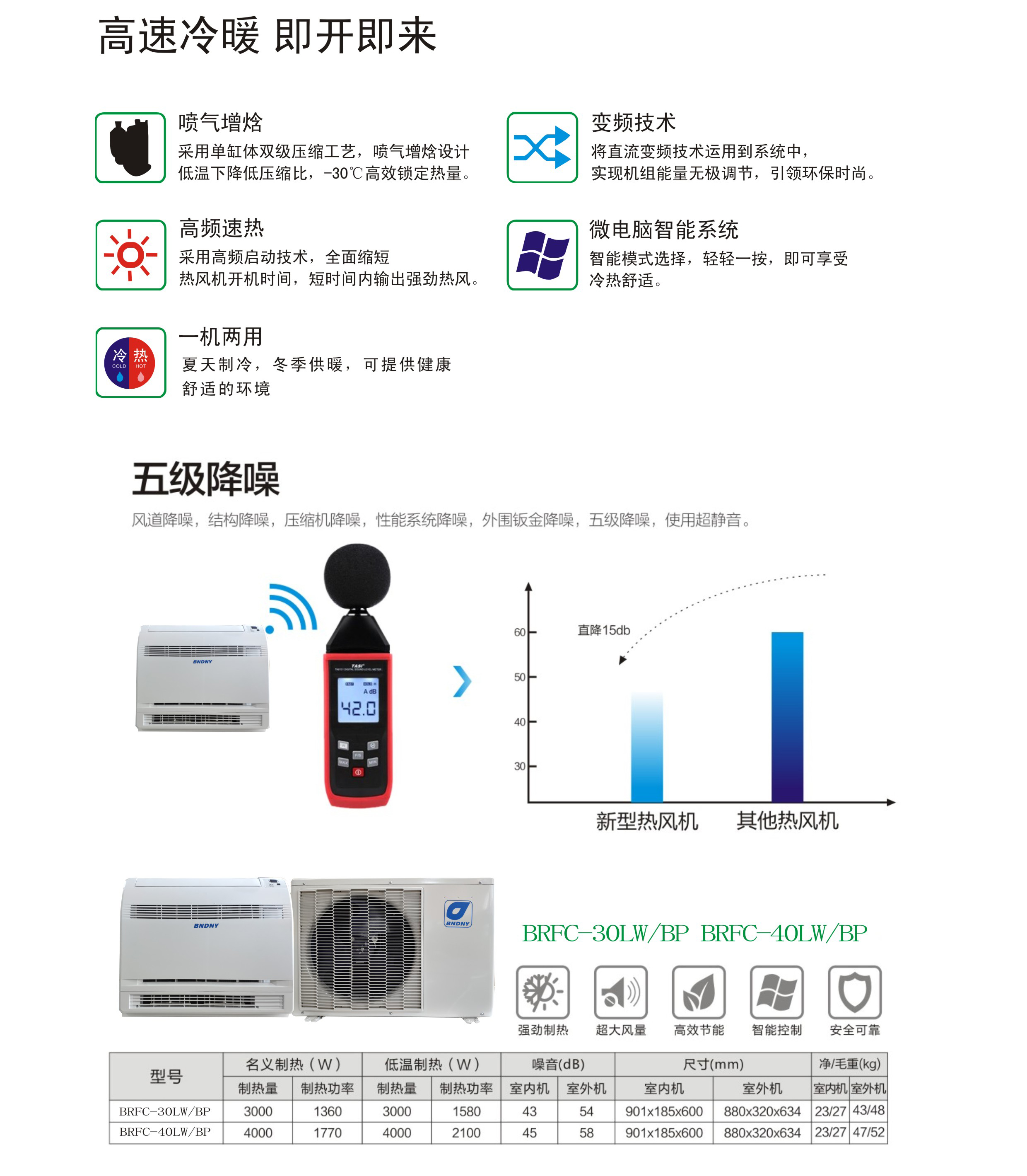 項(xiàng)目采用博納德空氣源熱泵熱風(fēng)機(jī),機(jī)組采用新型410A環(huán)保工質(zhì),清潔能源,對臭氧層無破壞,有效減輕溫室效應(yīng),是可靠的掃霾利器。安裝簡單快捷,室內(nèi)機(jī)室外機(jī)分別安裝,占用空間小,不需破壞裝修, 室內(nèi)機(jī)采用遙控器操作,室溫、風(fēng)速調(diào)節(jié)簡單可靠,可預(yù)約開關(guān)機(jī),運(yùn)行環(huán)境在-30度~46度,可調(diào)溫度在16度~31度。3K熱風(fēng)機(jī)可適用在15~22平方米房間,4K熱風(fēng)機(jī)可適用在20~28平方米房間。