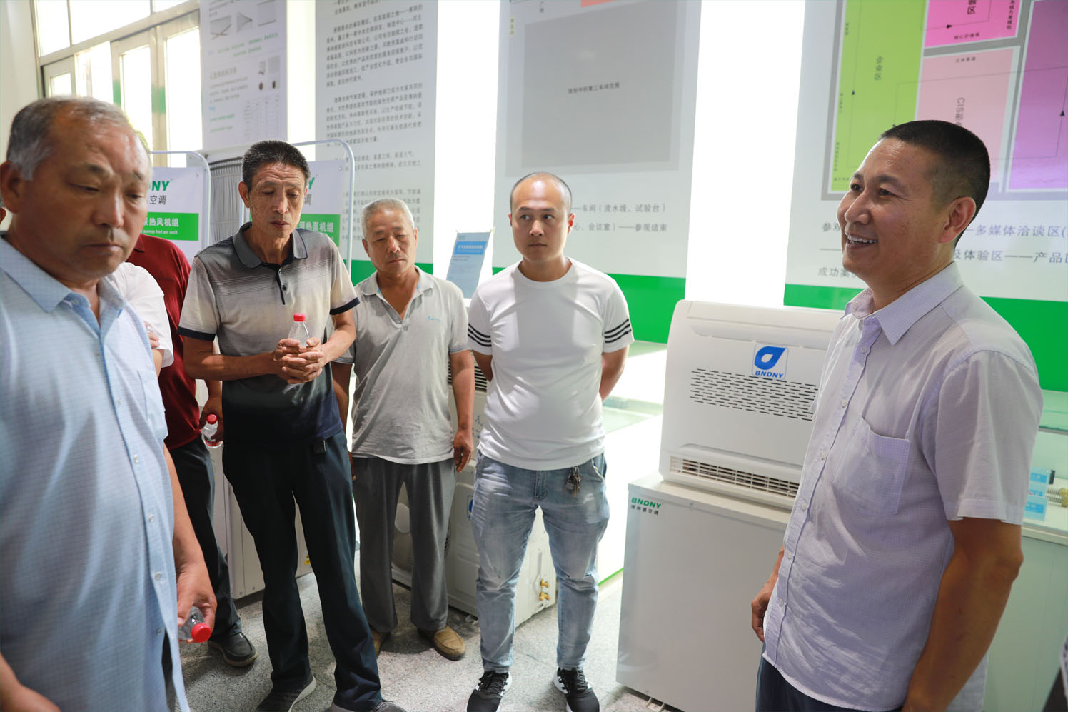 代表團(tuán)一行先來(lái)到博納德公司,參觀公司綠色展廳,觀看公司宣傳片,由副總經(jīng)理趙海朝向大家講解地源熱泵技術(shù)規(guī)范、原理等。隨后代表團(tuán)一行赴煤改電村--光燦村,走訪用戶實(shí)地查看地源熱泵安裝使用詳細(xì)情況,總經(jīng)理劉兵為大家詳細(xì)介紹并解疑。